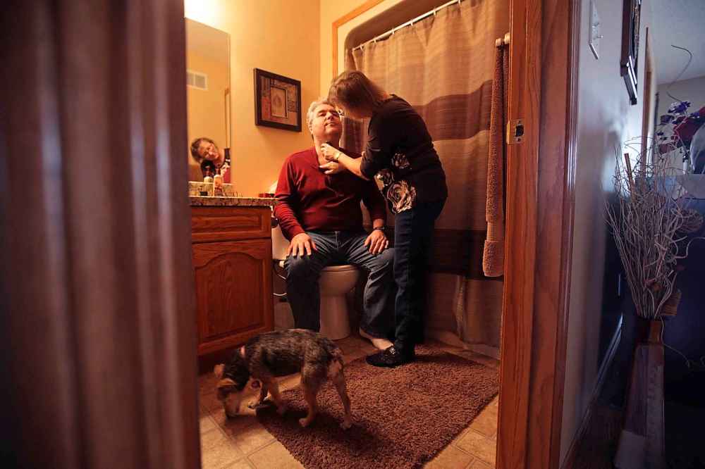 Sandy McLean shaves her husband, Doug's face because he cannot do that himself anymore. Doug, 61, has Lewy Body dementia. He first noticed the changes in his mid-50s. Sandy and Doug still living together and use home care services.PHIL HOSSACK / WINNIPEG FREE PRESS