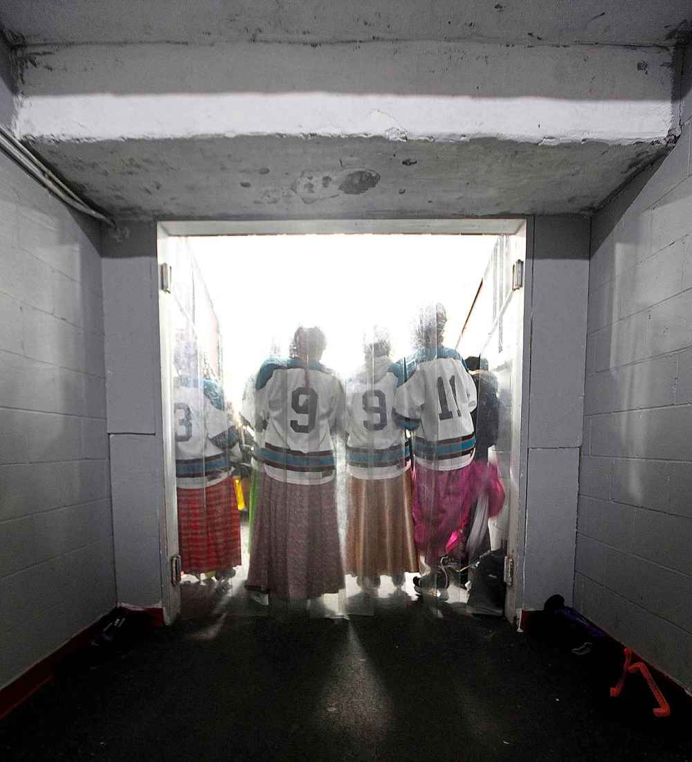 From left, Kaitlyn Waldner, Karissa Maendel and Ashley Maendel get their game faces on for their matchup against the MacGregor Iron Maidens.RUTH BONNEVILLE / WINNIPEG FREE PRESS