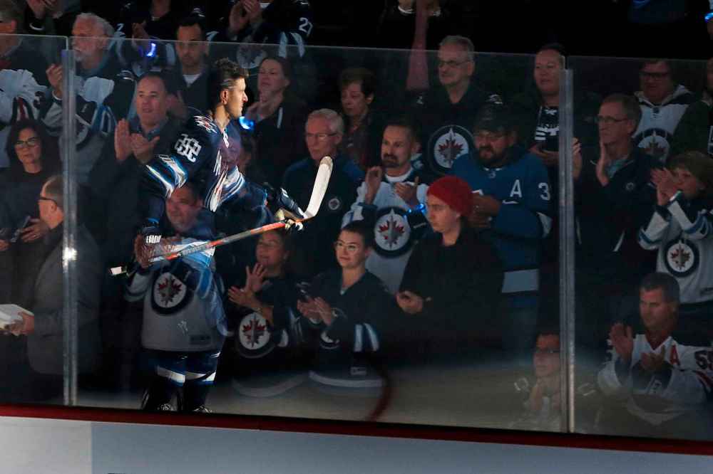 October 9 — Winnipeg Jets' Mark Scheifele (55) is reflected in the glass as he enters the rink prior to first period NHL action in Winnipeg.MIKAELA MACKENZIE / WINNIPEG FREE PRESS
