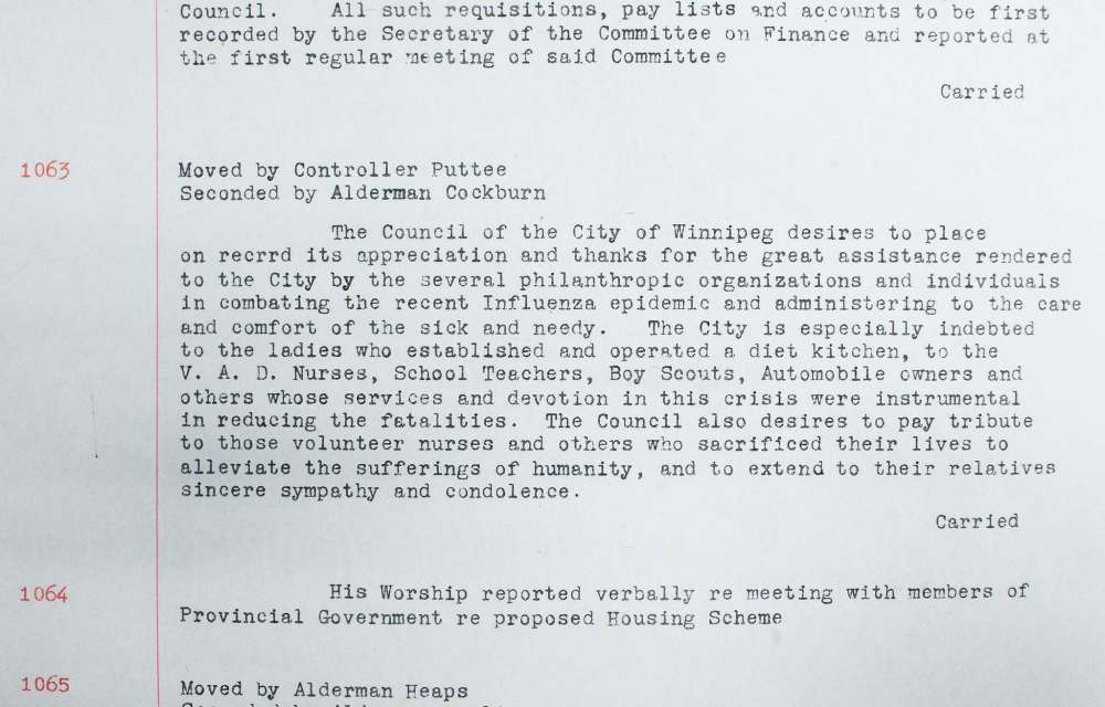 There was almost an immediate shortage of nurses. Winnipeg women volunteered to fill the breach by working with flu victims both in hospitals and by making house calls. One volunteer group, the Margaret Scott Nursing Mission, visited 2,000 homes alone.