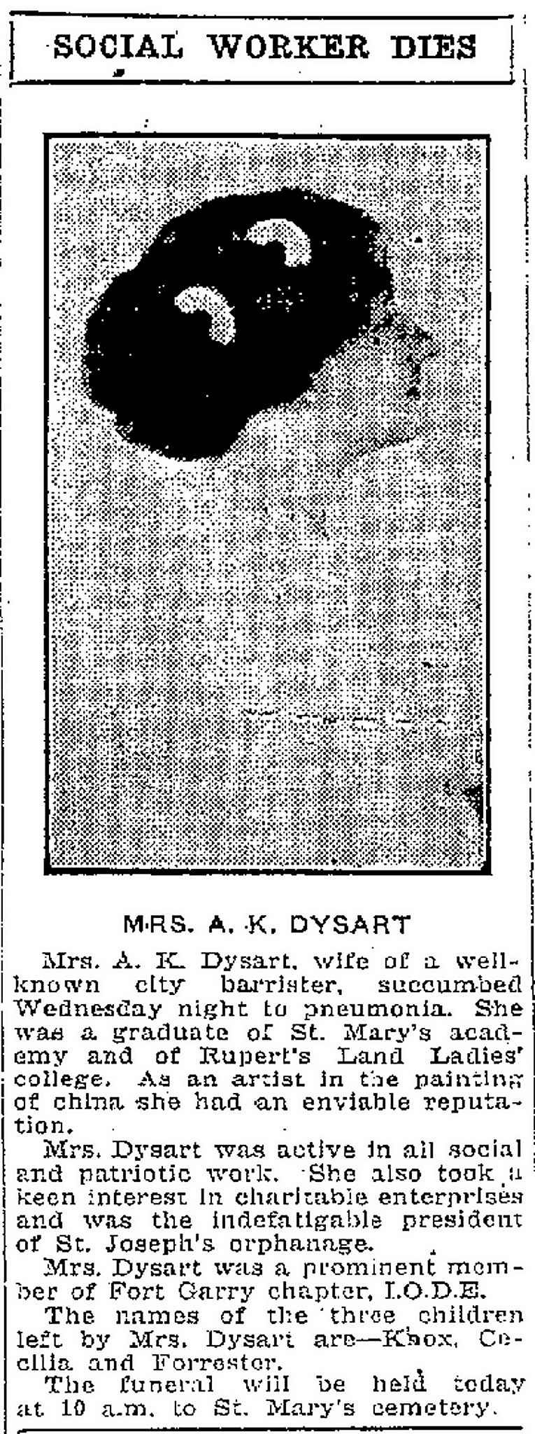 Claire married well, to A. K. Dysart, a prominent barrister named to the King’s Counsel, an honour bestowed upon exceptional lawyers. She was president of the St. Joseph’s Orphanage. She died on Oct. 10, 1918. She was just 31.