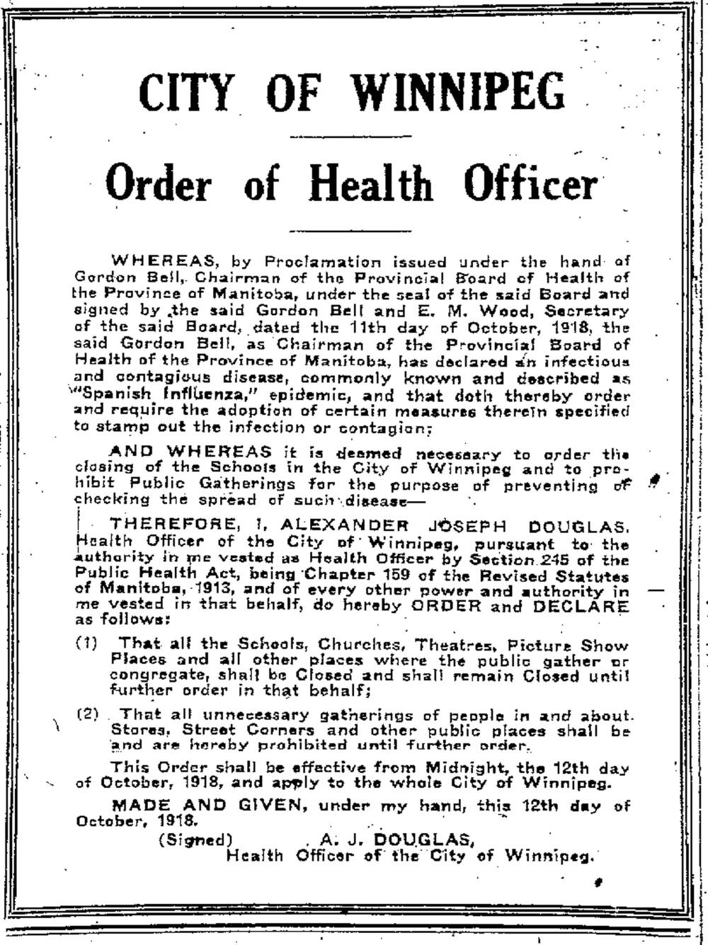 All Manitoba schools were closed, including universities and colleges, and all church services were cancelled. Entertainment venues such as movie theatres, dance halls, even public bathhouses, were shuttered.