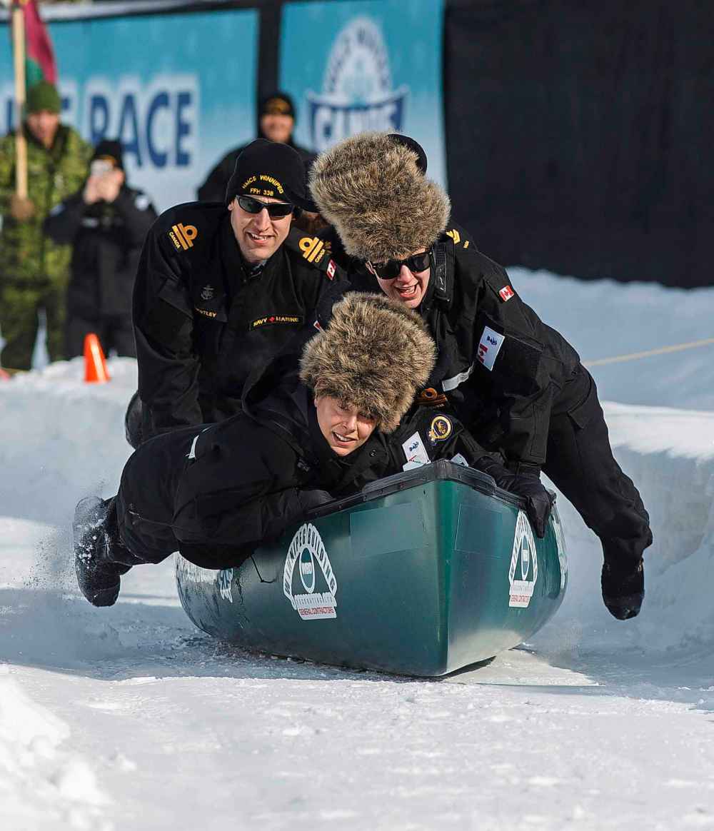 The HMCS Winnipeg Hard Chargers easily beat the 16/17 Field Ambulance team Saturday afternoon, February 16, 2019 at Shaw Park. The Wild Winter Canoe Race is where teams of five “kick-stroke” their canoes over a snow-packed course, raising money that will go towards the ‘Sharing Together Partager Ensemble Fund,’ a collaboration between the St. Amant and DASCH Foundations.TREVOR HAGAN / WINNIPEG PRESS