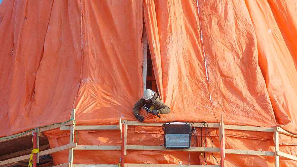 Jacques Boulet from Winnipeg climbs down a ladder after helping to clean off the top of Franziska Agrawal’s (right) sculpture ‘Prisma’ which is part of the International Snow Sculpture Symposium at the Festival du Voyageur which kicks off today, Thursday, February 14, 2019.TREVOR HAGAN / WINNIPEG PRESS