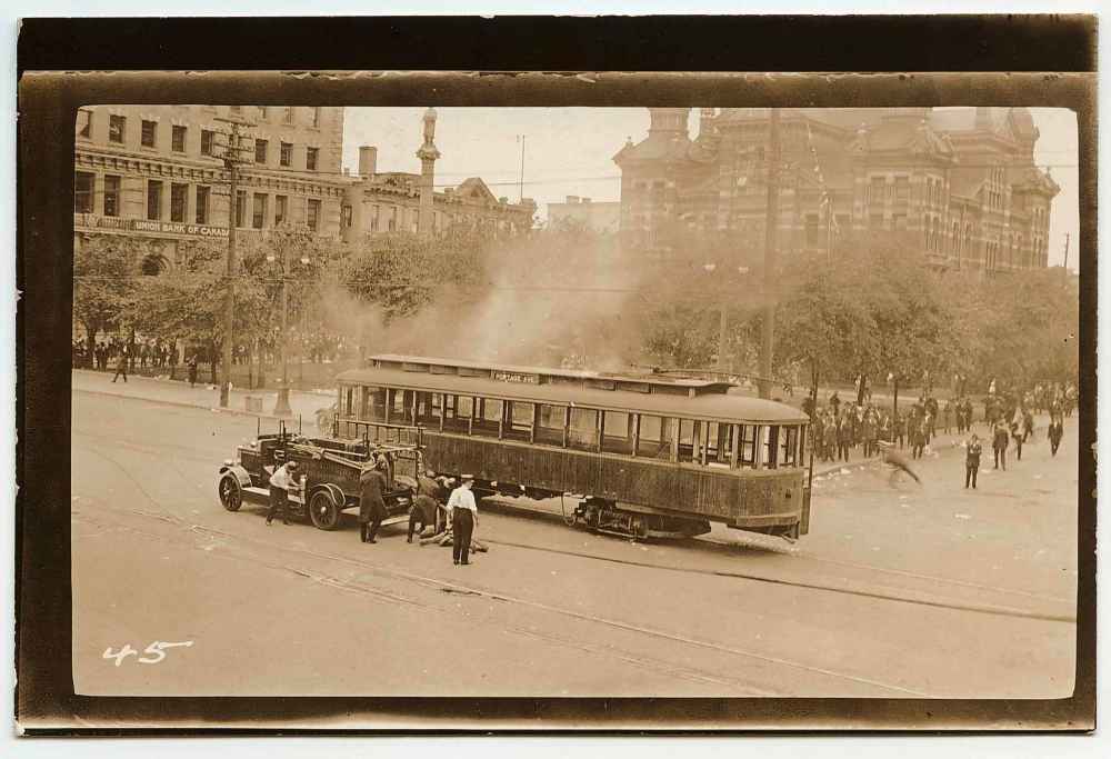 At about 2:20 p.m. on June 21, 1919, a lone streetcar rattled down Main Street toward Portage Avenue with a few passengers aboard.