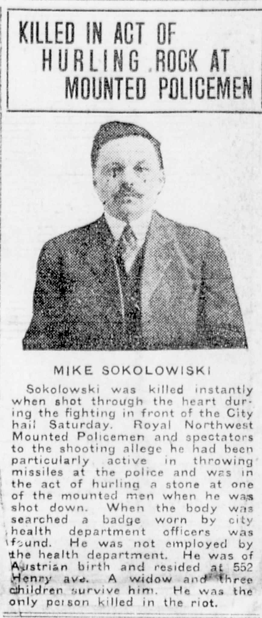 Mike Sokolowski, an immigrant born in western Ukraine, was shot through the heart and died instantly. Local newspapers said Sokolowski, a tinsmith, was throwing bricks at police. Accounts from visiting reporters, however, claimed he was an innocent bystander cut down in the spray of police bullets.