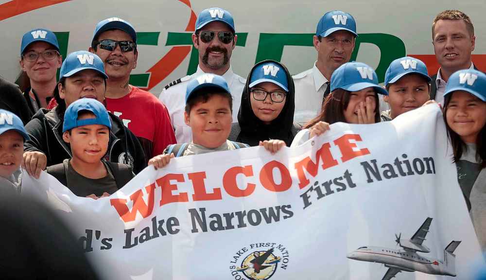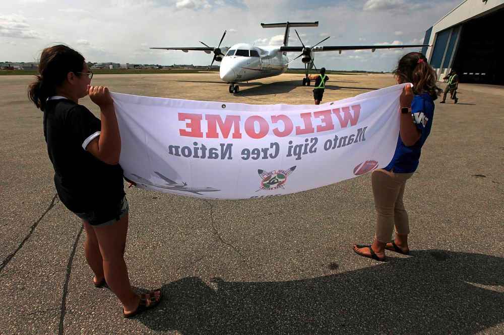 A few hours previous, a Perimeter Airlines charter flight landed with 40 Cree youth and their chaperones from God’s Lake and Manto Sipi Cree Nation. They were met with banners, held by Bombers and airlines staff, featuring each community’s name.