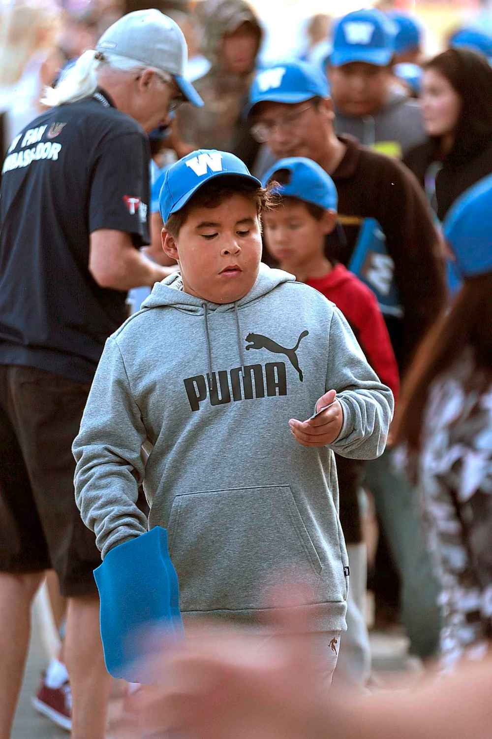 The Bombers won the the game, topping the B.C. Lions, but frankly, it doesn’t really matter. The children of God’s Lake and Manto Sipi cheer regardless. The group appeared on the huge video board near the end of the second quarter; team mascots Buzz and Boomer visit to give everyone high-fives soon after.