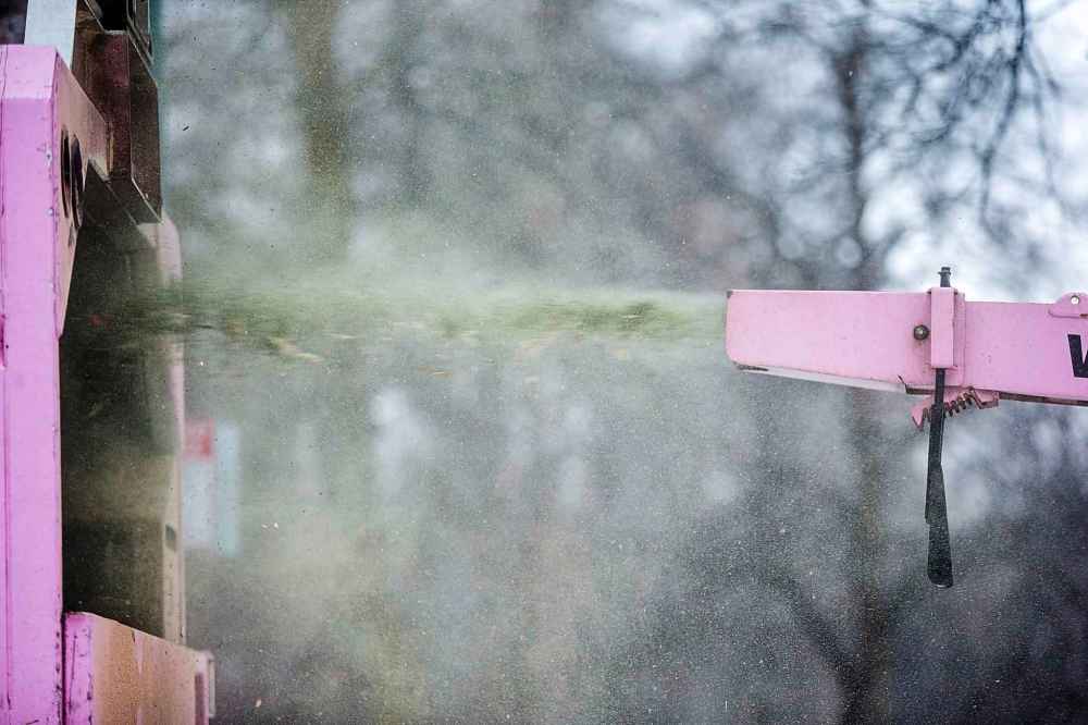 It takes workers less than a half hour to reduce the pile of Christmas trees to wood chips. And that includes time to shake snow and other debris off the trees, to examine them for metal and plastic before heaving them into the chipper, and even to sweep up the fallen needles.