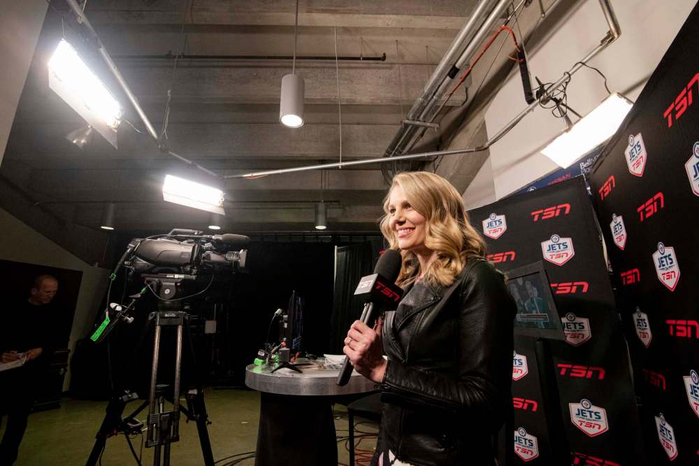 The moment the Jets leave the ice, she and the rest of the broadcast crew have a quick meeting before she snags Paul Maurice for a coach’s interview that will air during the pre-game show. Absolutely, she says when asked if the Jets bench boss is as cordial off-camera as he is on.