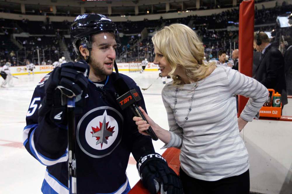 Following their tete-a-tete, Orlesky will either file a story for Sportscentre if news such as last week’s status on defenceman Dustin Byfuglien is breaking, or begin working on her two-minute intro for that night’s show, which she’ll deliver at ice level in the southwest corner of the arena — the Zamboni corner, she calls it.