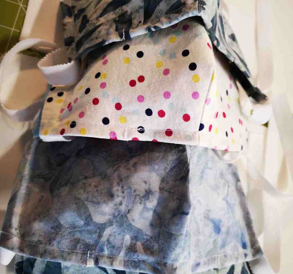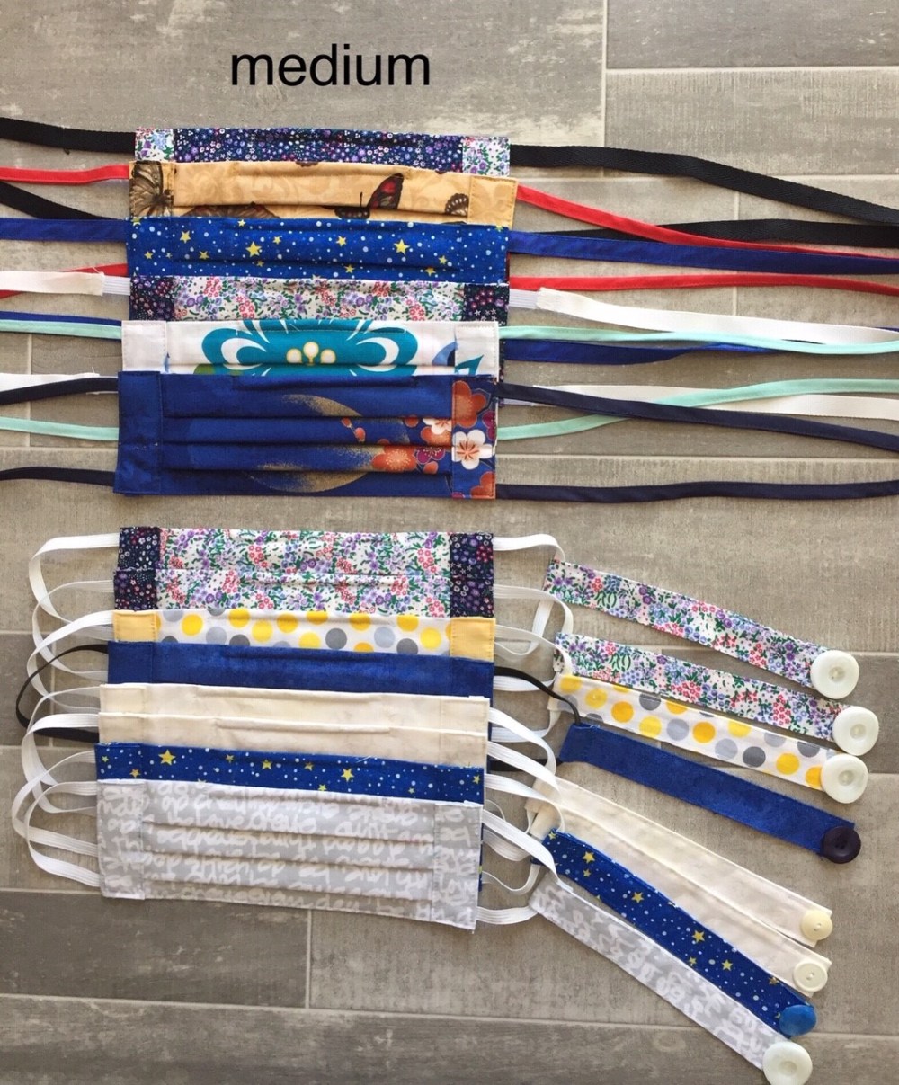 I make 3D style masks in two sizes. Each mask is made up of a bottom and top layer of 100 per cent cotton and non-woven interfacing middle layer/liner. Each mask has a nose wire for personal comfort and fit.