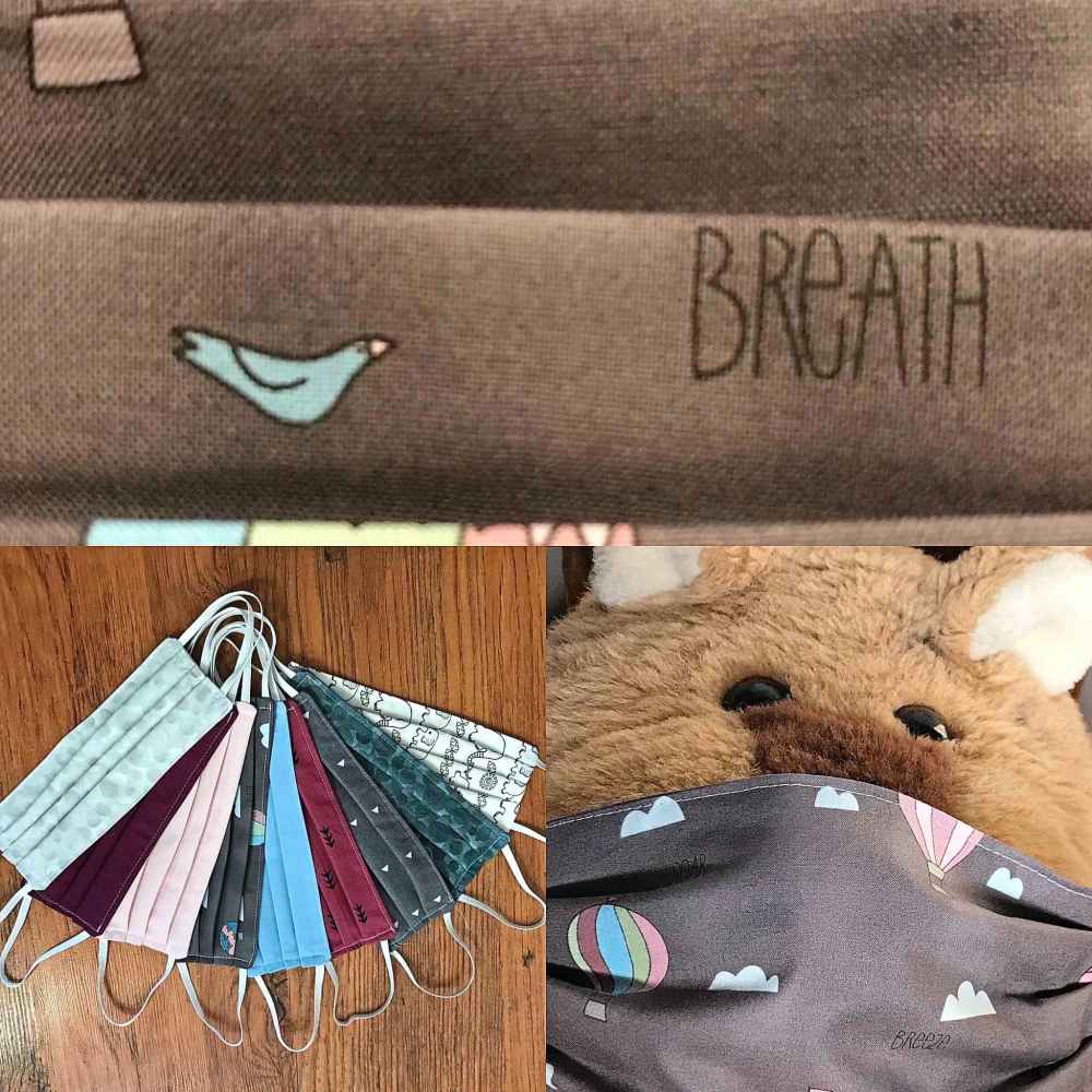 Masks are cup style, in a variety of colours and patterns with a waterproof inner layer to act as a filter. They are available in adult and child-sized, finished with customers choice of elastic or string ties. Also offering additions like matching scrunchies or travel bags while supplies last.