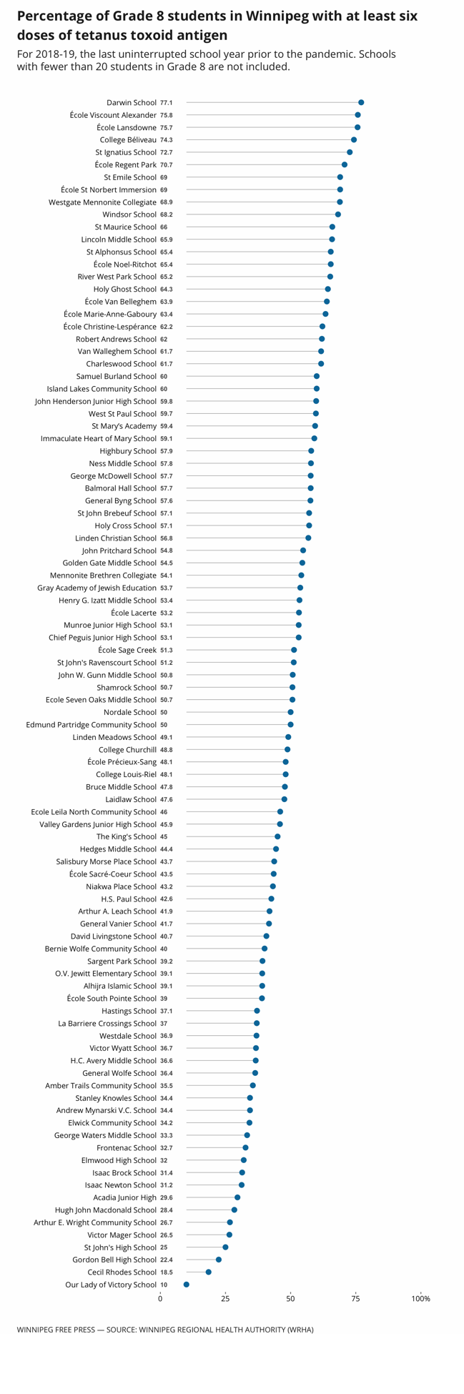 As for the percentage of students with up-to-date tetanus shots, Our Lady of Victory School in Riverview, and Inkster-area schools Cecil Rhodes School and Shaughnessy Park had rates under 20 per cent.