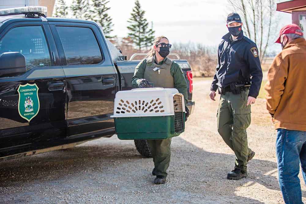 It’s just before 10 a.m. when the waiting is interrupted by the sound of tires coming down the gravel driveway. Two uniformed conservation officers step out of the truck and head into the nursery with a large dog kennel in tow.