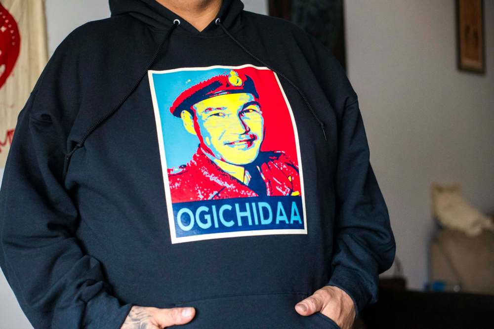 You can order your own Ogichidaa hoodie by messaging Spence at Helping Hand Warriors on Facebook or Instagram. T-shirts are available for sale at Atlas Pawn Shop, 836 Main St.