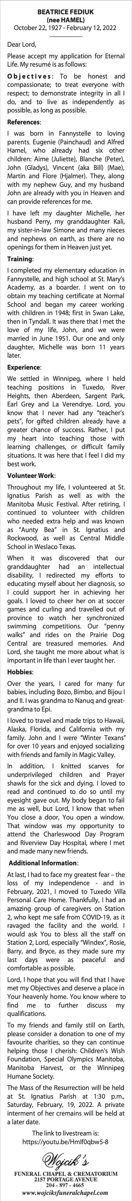 I’ve seen people who have written their own obits and write funny ones, but Beatrice Fediuk is the 1st to put in a resume to get to Heaven. She has references, experience, volunteer work and she says if the Lord needs more you know where she is #RIP #wfp https://t.co/uVBMOnXEIb pic.twitter.com/45QQcMiGXX