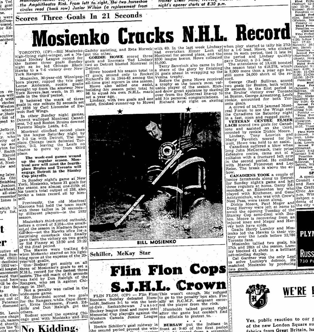 In doing so, Mosienko set an everlasting record, registering the fastest hat trick in NHL history. The Winnipegger scored three goals in just 21 seconds — each assisted by centre Gus Bodnar — to propel the Blackhawks to a 7-6 comeback victory over the Rangers.