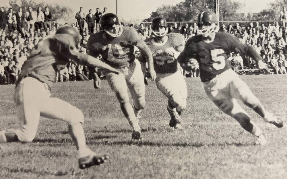 UNIVERSITY OF MANITOBA ARCHIVES Bisons quarterback Nick Laping (25) eludes a swarm of would-be tacklers during the 1962 season.