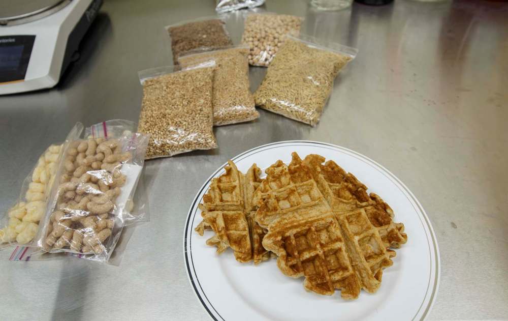 The work has innumerable, tangible benefits to food research in the province, says Joseph, standing in front of the machine, holding a plate of waffles made from Manitoba crops.