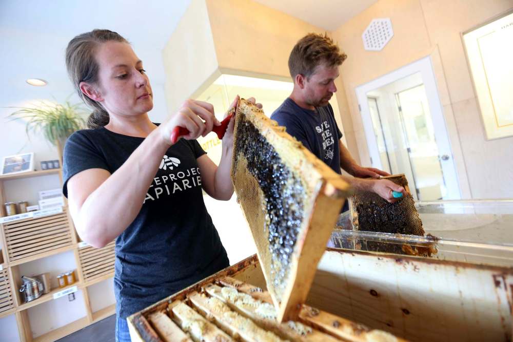Apiculturists Lindsay Nikkel and Chris Kirouac of Beeproject Apiaries slide out each of the hive’s wooden frames, scraping through the honeycomb’s hexagonal cells with a special “scratcher” to let the honey flow freely.