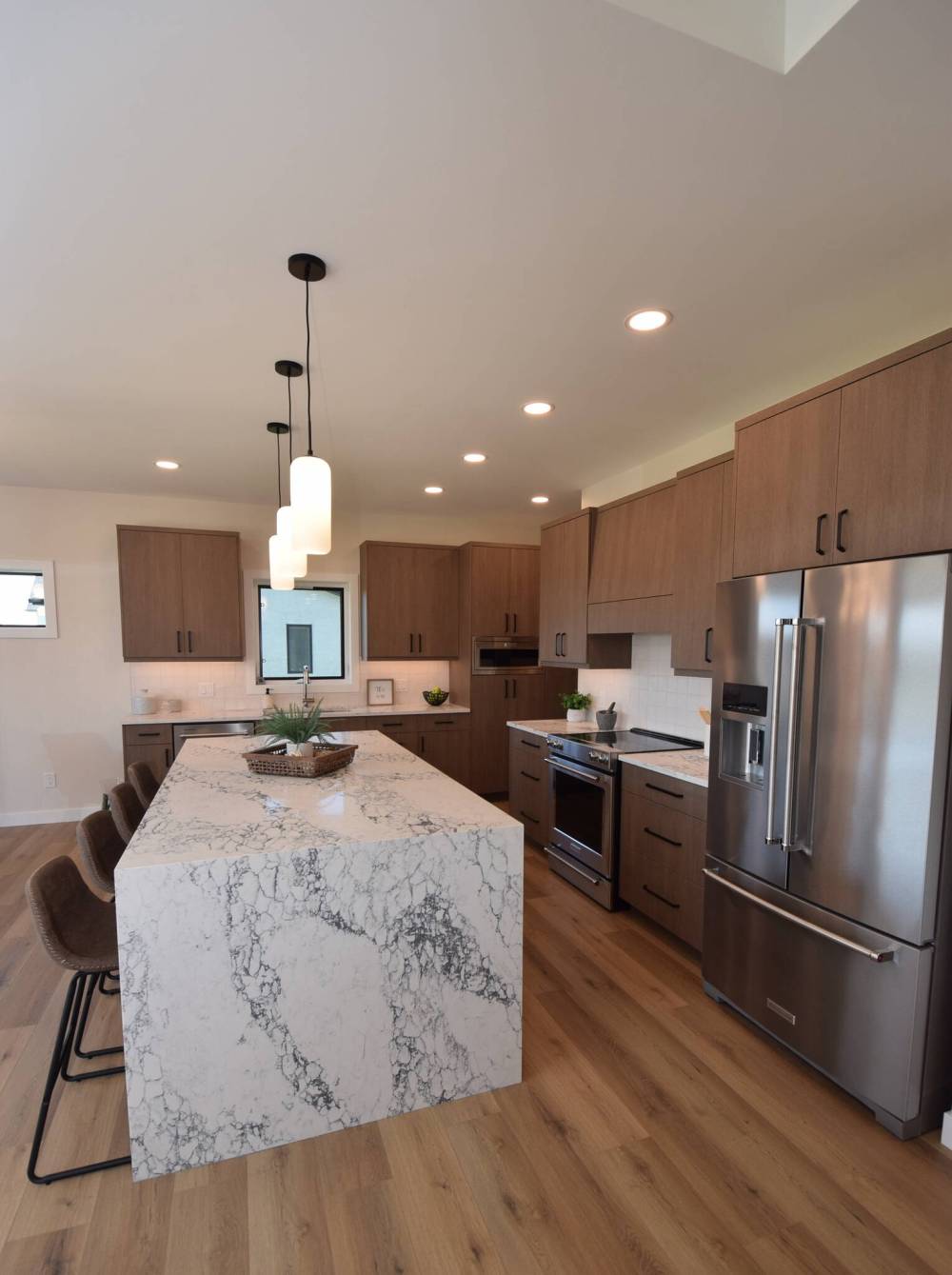 A dramatic quartz island with waterfall sides grabs your attention in the kitchen at 4 Bryce Blvd. in Oak Bluff West.