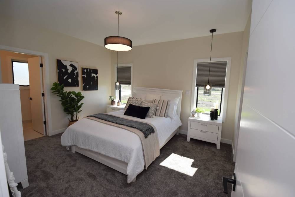 “I really like how a seven-foot hallway adds separation,” Kirady says. “That creates a very private bedroom wing that offers two large secondary bedrooms, a beautiful four-piece bath and a cosy, well-isolated primary bedroom that comes with a luxurious ensuite with a walk-in shower with rain shower head and spectacular marble-style surround.”