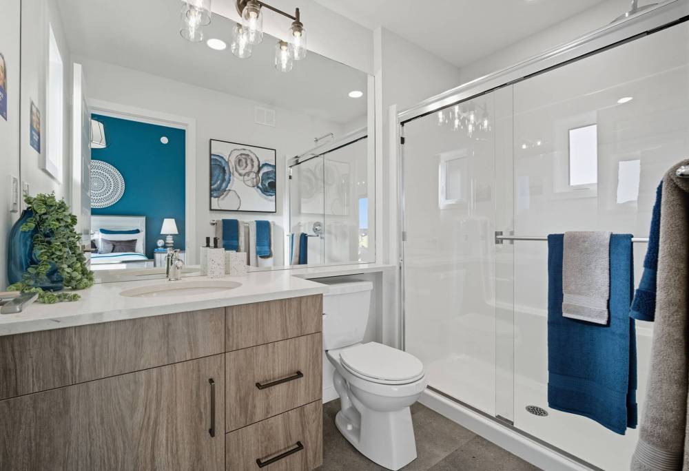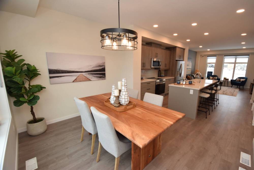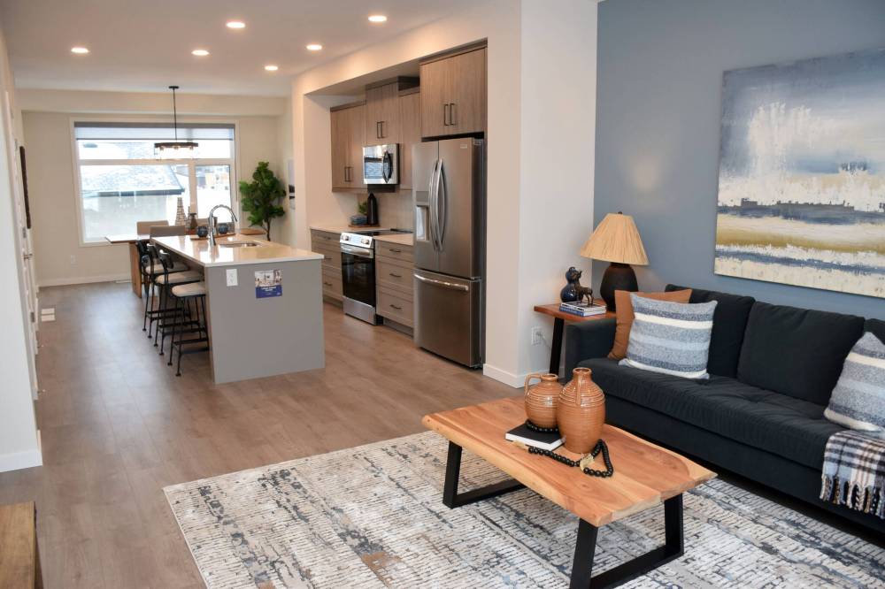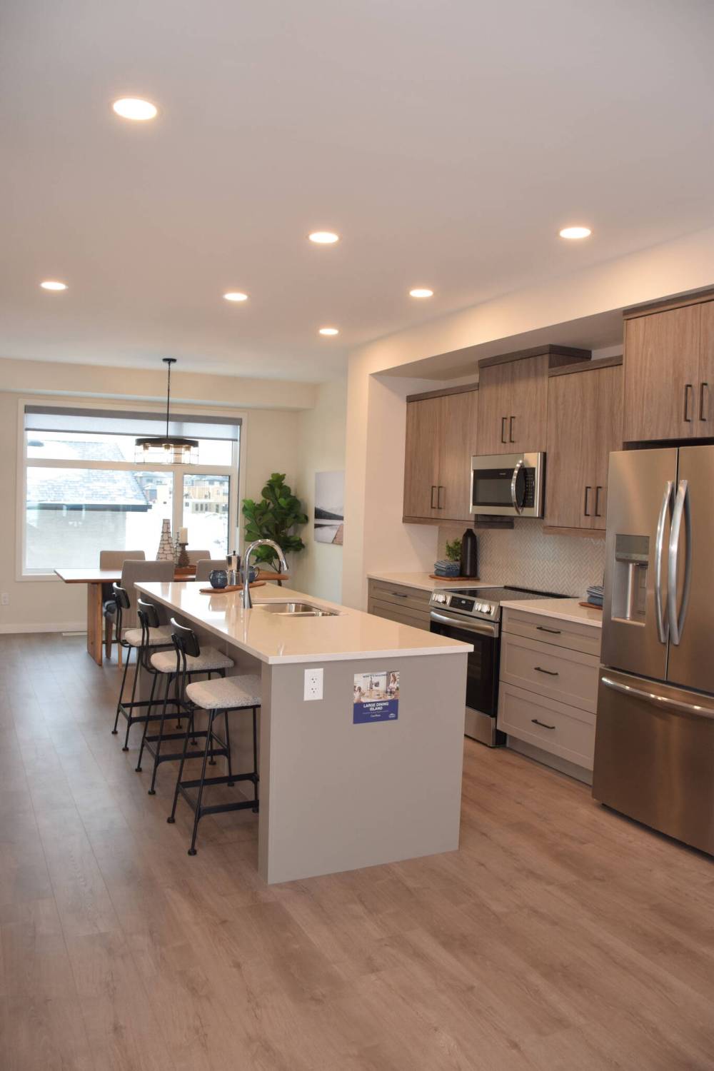 “It’s a good looking home with its two-tone exterior and angled roofline,” says Dave Mick, new homes sales consultant for the 1,433-sq.-ft., two-storey home. “The horizontal siding really frames the windows, and the acrylic stucco looks amazing. That’s what draws you in. But once you come inside you realize its interior is as good, or even better, than its exterior.”