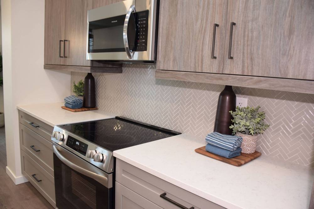 Woodgrain-style thermofoil cabinets and a taupe herringbone-style backsplash combine with quartz countertops and taupe pot drawers to elegantly frame the slide-in range.