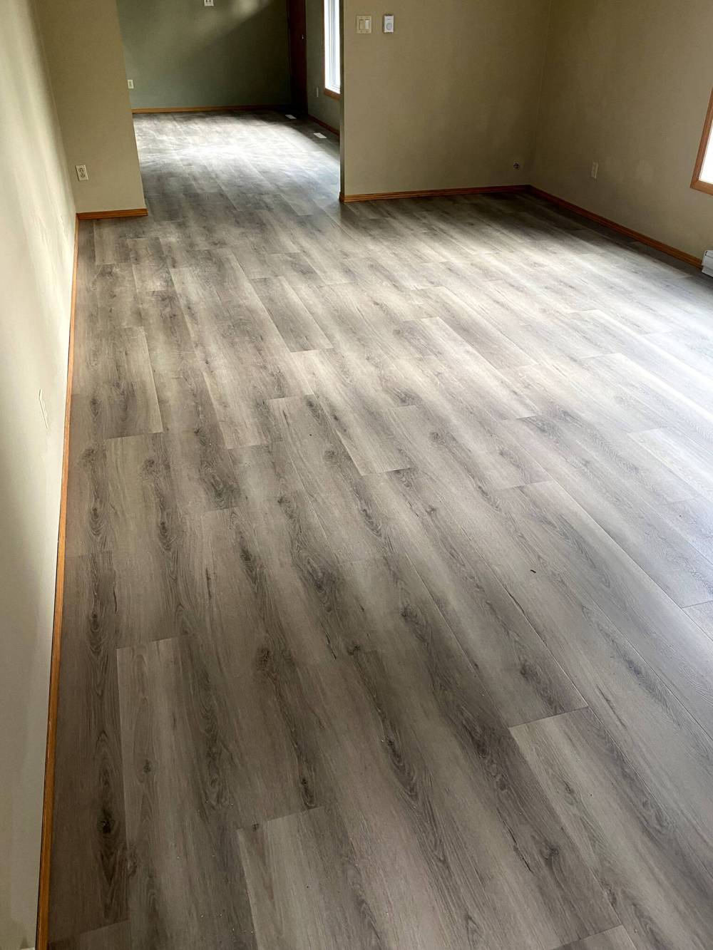 Once the vinyl installation process was completed, matching reducers were installed along both stretches of height difference. Although a consistent flooring elevation throughout the main floor of the home would have been optimal, the reducers did indeed conceal the discrepancy quite well. The baseboards were then reinstalled along the perimeters of all rooms, marking the conclusion of the vinyl-flooring installation.