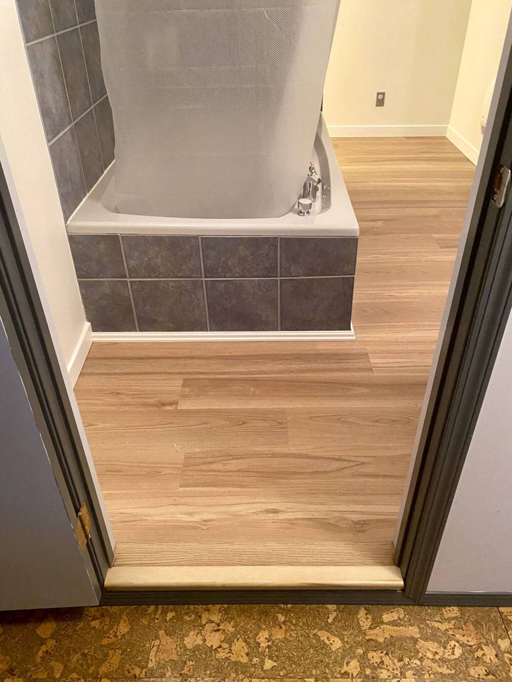 The tub was fitted with new trim along the perimeter to match the upgraded baseboards following the vinyl-plank installation.