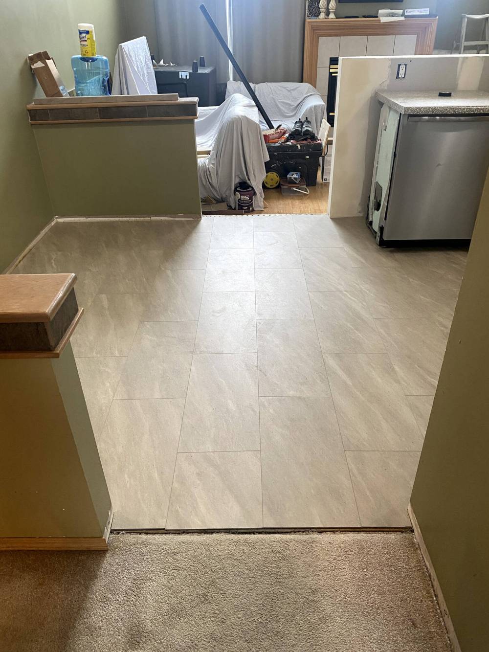 To maintain the flow of the room, vinyl orientation was set parallel with the entry to the kitchen.