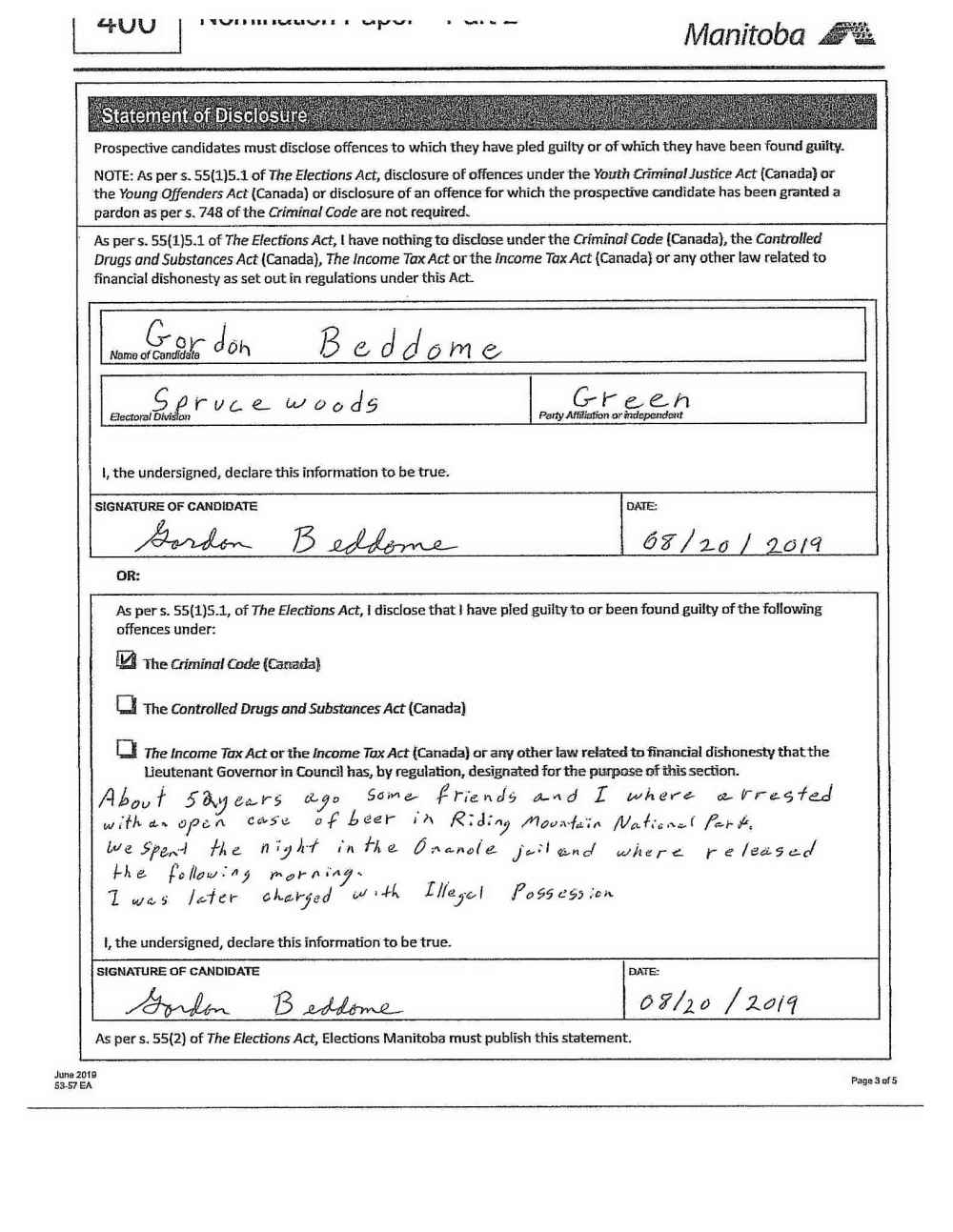 Some disclosures border on silly. Green candidate Gordon Beddome (Spruce Woods) admitted to being “arrested with an open case of beer in Riding Mountain National Park” and spending “the night in the Onanole jail” with friends in 1967 — fifty-two years ago.