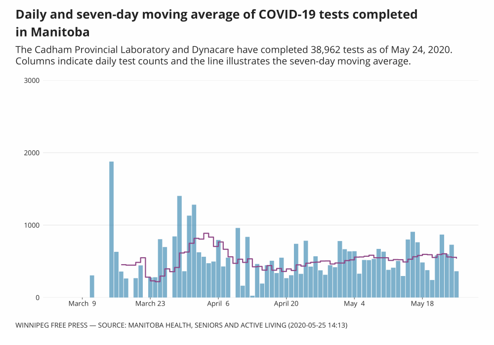 Manitoba is only using about one-third of its testing capacity. It has the capacity to test between 1,000 and 2,000 people a day. But so far in May, it has only tested a daily average of 565 people. In April, the daily average was 550.
