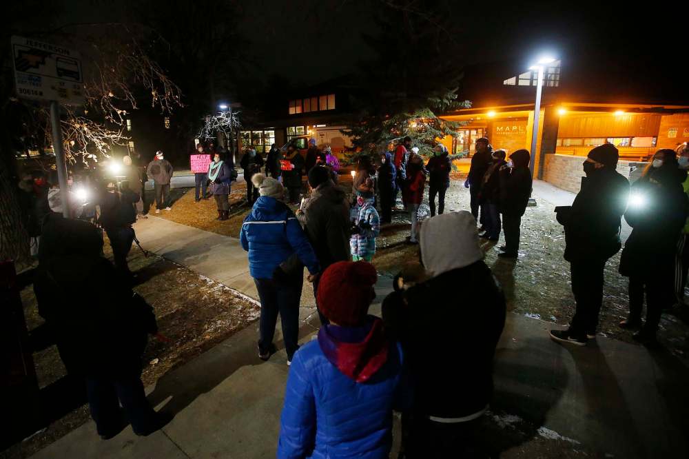 Family members gather outside Maples Personal Care Home for a vigil for residents in Winnipeg.. COVID-19 has killed many residents of the care home.