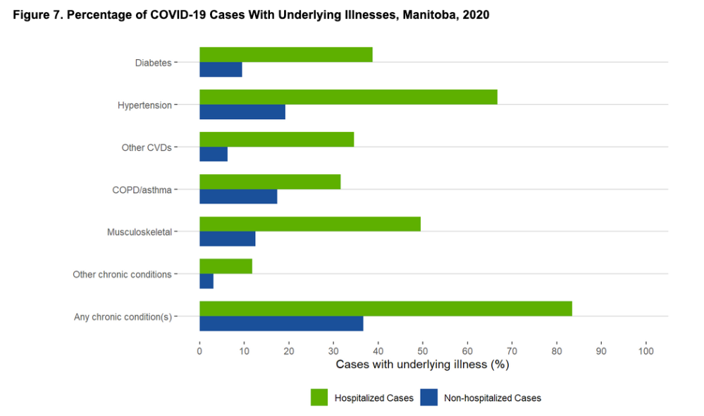 Manitoba releases some of those profiles in its weekly COVID-19 surveillance reports. Public health publishes the percentage of people in hospital with the disease who have other medical conditions (such as diabetes, hypertension and heart disease).