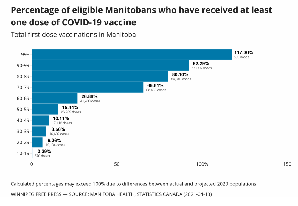 Based on both timelines and vaccines already in stock, the province isn’t hitting its targets for those age groups (it has for older Manitobans; 83 per cent of those over the age of 80 have received at least one dose).