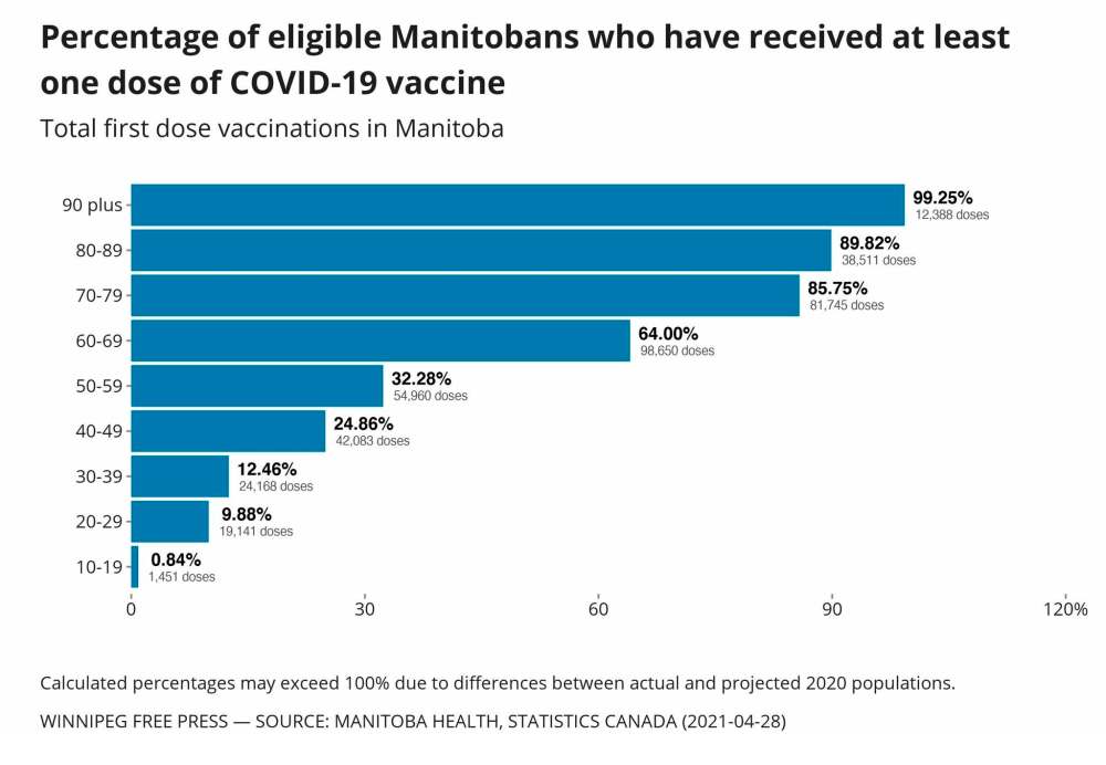 By Canada Day, at least 70 per cent of Manitoba adults in all age cohorts will likely have had a first shot.