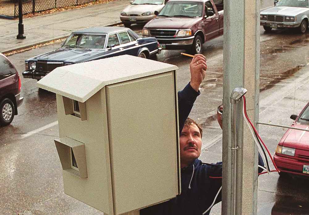 JOE BRYKSA/WINNIPEG FREE PRESS FILES A worker installs the first red-light camera at the intersection of Broadway and Sherbrook Street in 2001.