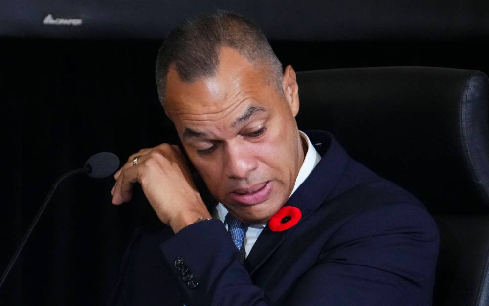 Former Ottawa police chief Peter Sloly wipes away tears as he get emotional while appearing as a witness at the Public Order Emergency Commission in Ottawa.