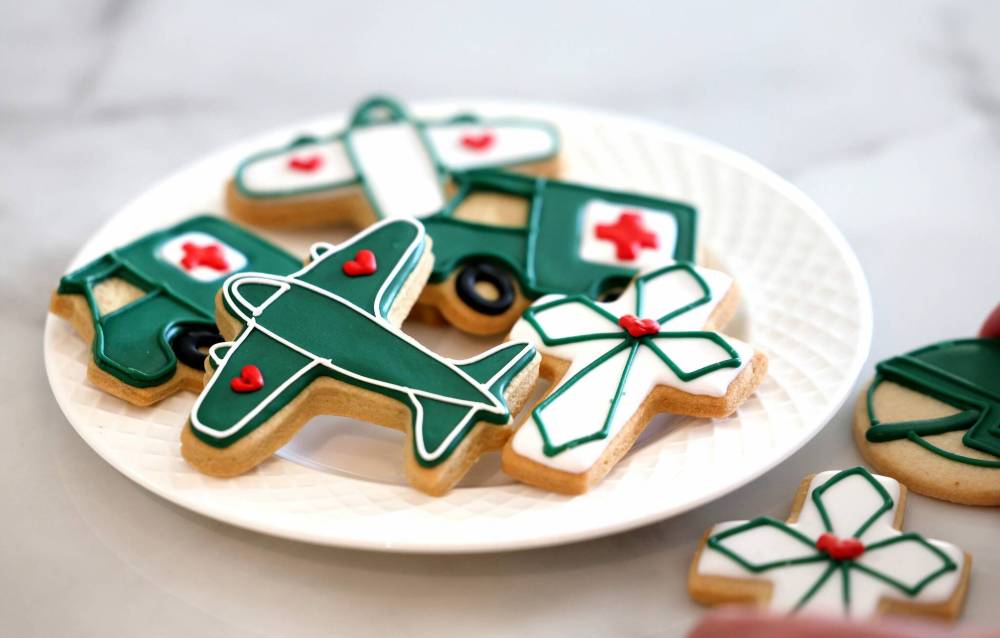 The cookies, “made with lots of butter with royal icing on top,” come in several shapes, including a plane, an ambulance and a cross.