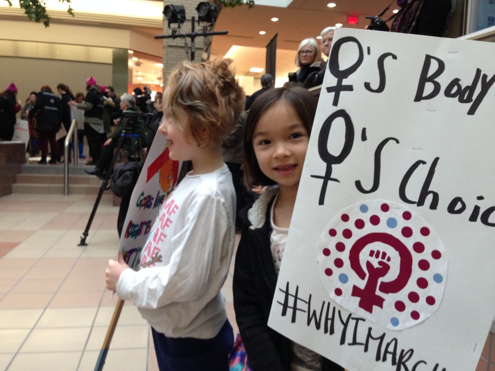 Jordan Ederton, 5, (left) and Linny Shaw, 7, hold signs in Portage Place Centre Court before start of the Women's March Saturday morning.