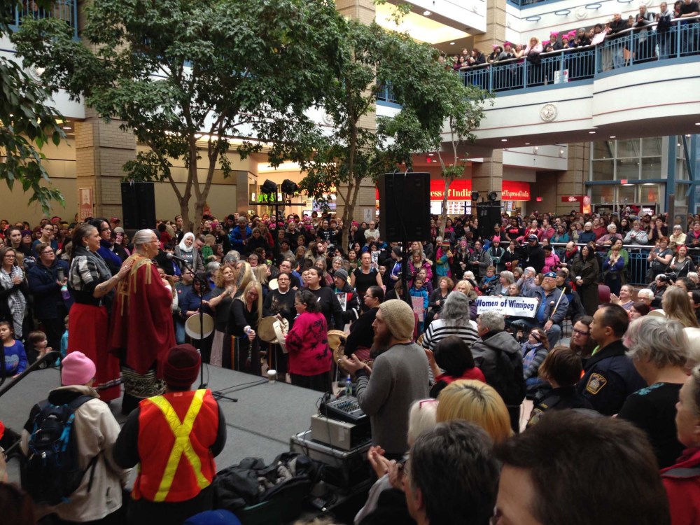 The crowd gathers to hear the speeches at Portage Place before the start of the march in Winnipeg.