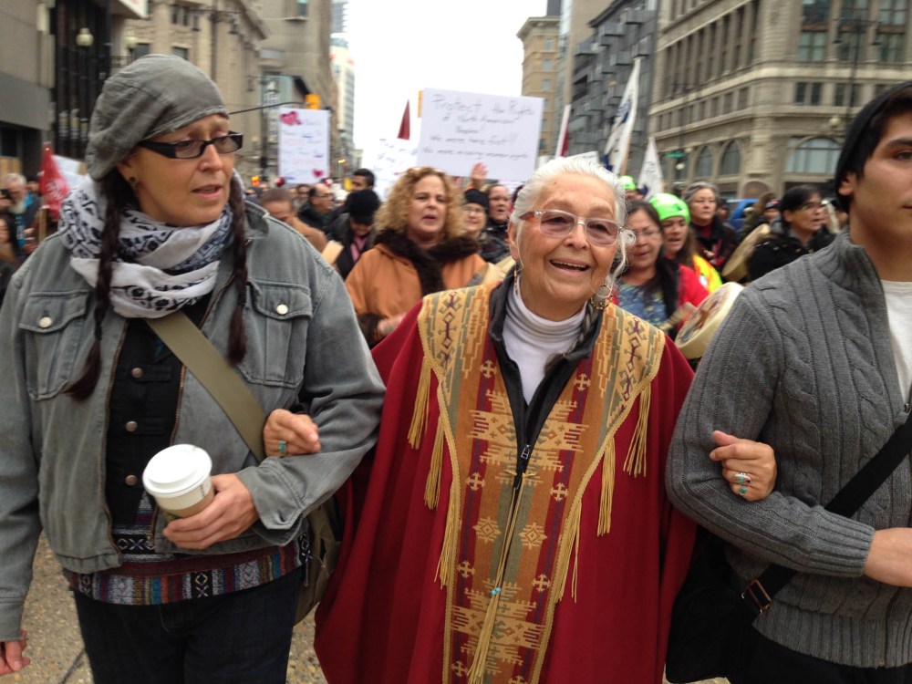Marchers hit the streets in downtown Winnipeg to show support to women gathered in Washington DC and around the globe..
