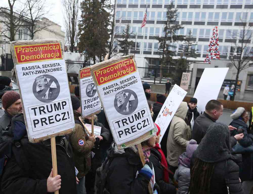CP Some 200 activists of women's organizations with "Down with Trump" signs and women's rights slogans walk from the office of the Prime Minister to the U.S. Embassy in Warsaw, Poland, Saturday, Jan. 21, 2017, in support of Women's March in Washington and protests around the globe saying they were concerned about the rhetoric that was raised in President Donald Trump's campaign. (AP Photo/Czarek Sokolowski)