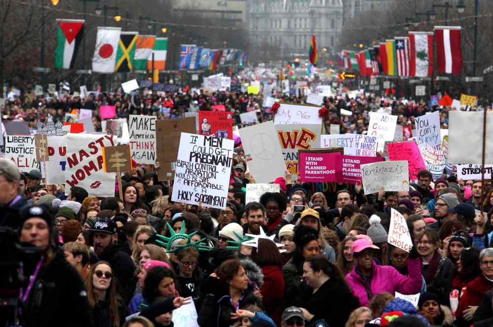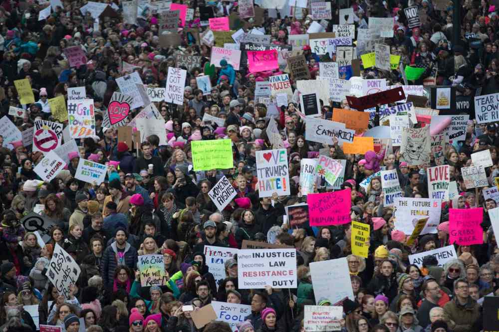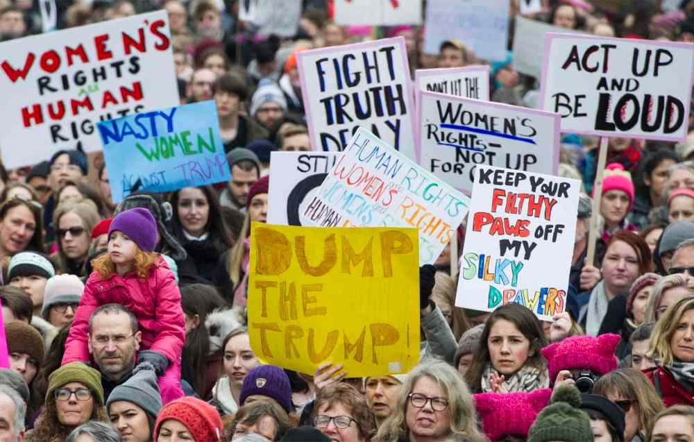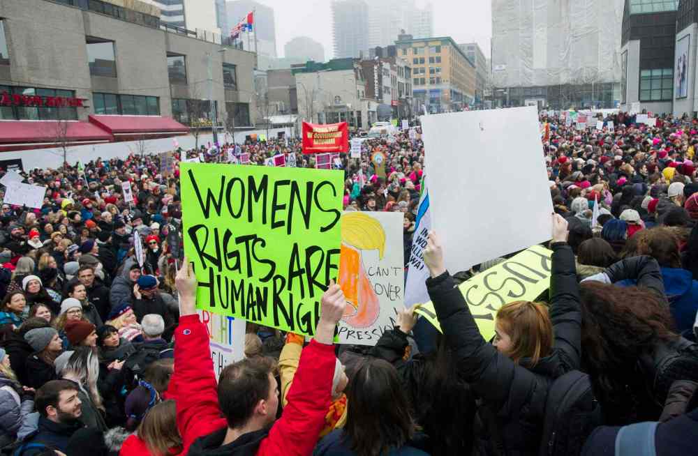 CP Crowds of people gather to protest the inauguration of U.S. President Donald Trump in Montreal, Saturday, January 21, 2017. Protests are being held across Canada today in support of the Women's March on Washington. Organizers say 30 events in all have been organized across Canada, including Ottawa, Toronto, Montreal and Vancouver. THE CANADIAN PRESS/Graham Hughes
