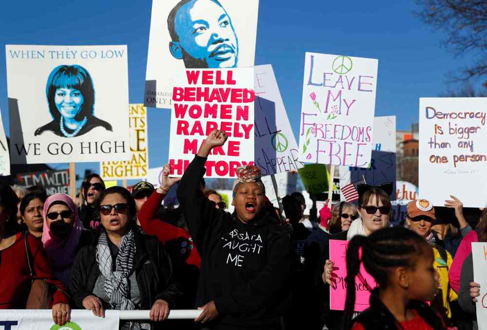CP Protesters hold placards with slogans, during the Women's March rally, in Geneva, Switzerland, Saturday, Jan. 21, 2017. People gathered against the inauguration of US President Donald Trump. (Salvatore Di Nolfi/Keystone via AP)
