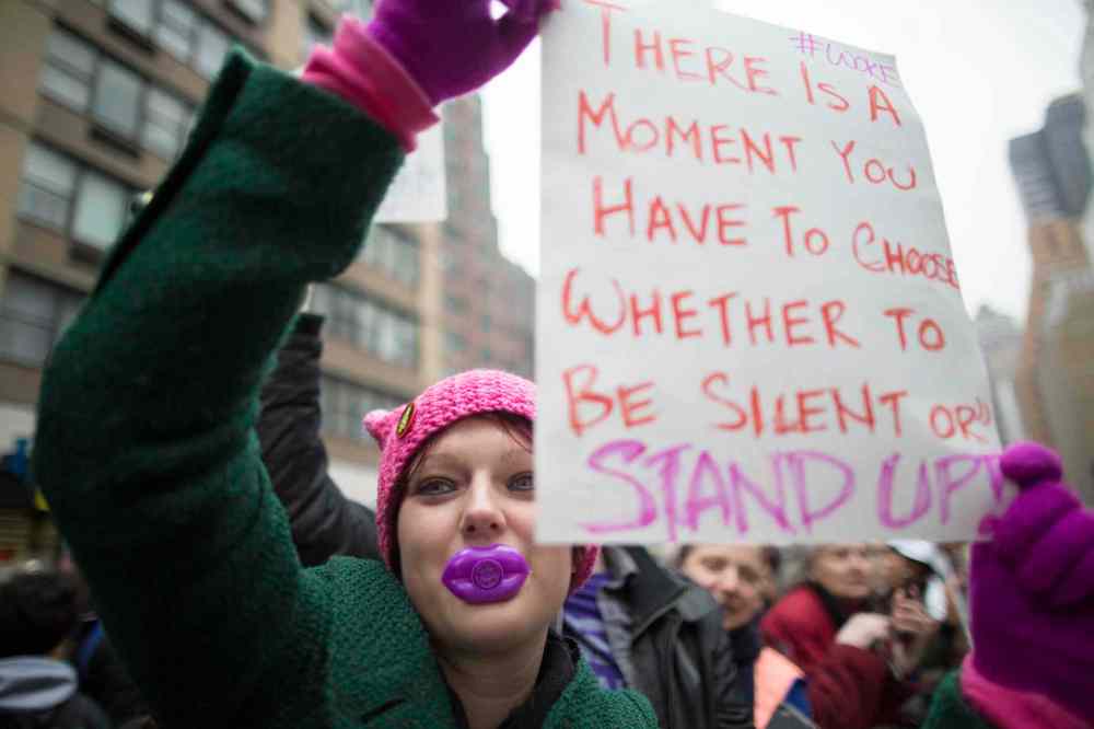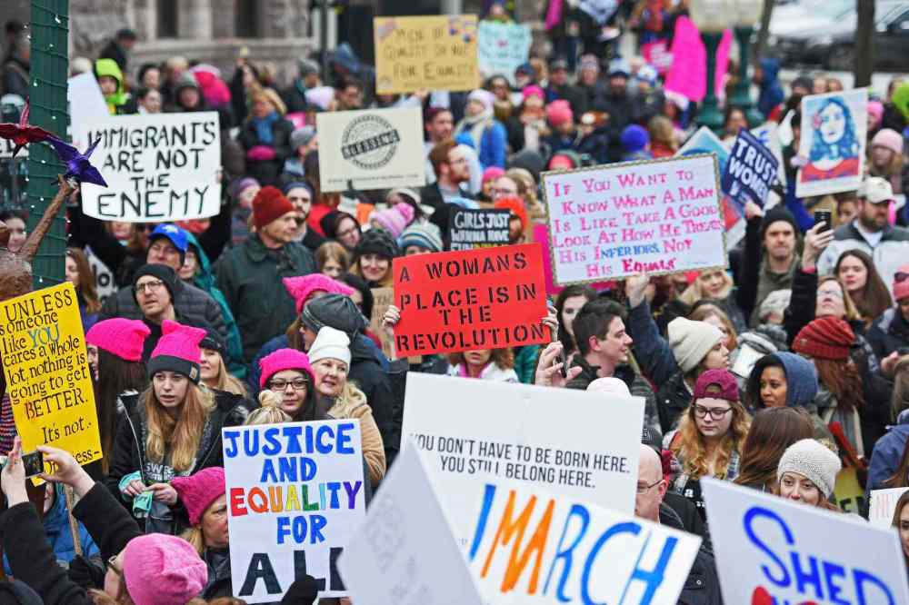CP A protester holds sign at Minnesota Women's March in front of state Capitol in St. Paul, Minn., on Saturday, Jan. 21, 2017. The march was held in in conjunction with with similar events taking place around the nation following the inauguration of President Donald Trump. (AP Photo/Jeff Baenen)