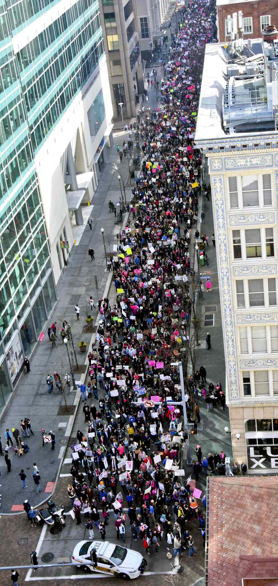 CP Demonstrators fills Fifth Ave. from Market to Grant Street during the Women's March in downtown Pittsburgh, Saturday morning Jan. 21, 2017. (Bob Donaldson /Pittsburgh Post-Gazette via AP)