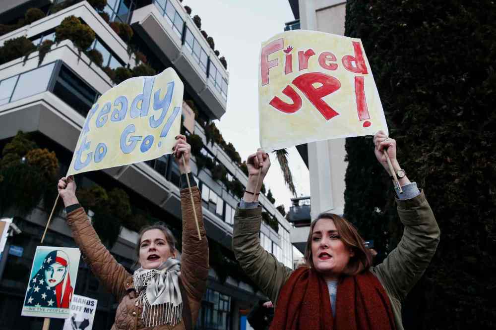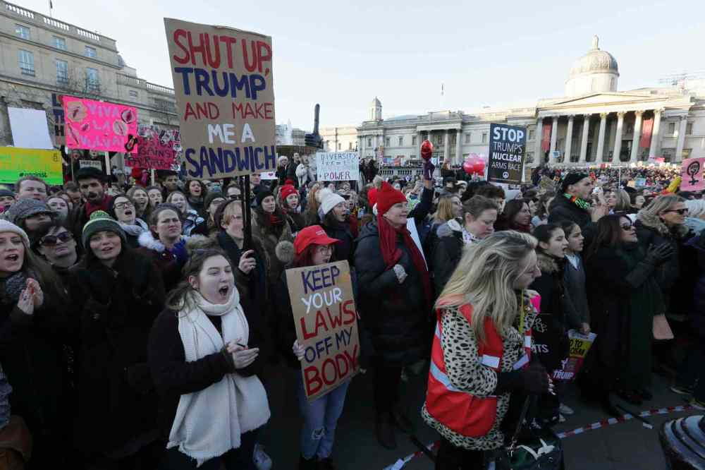 CP Demonstrators take part in the Women's March in Trafalgar Square, central London, following the Inauguration of U.S. President Donald Trump in London, Saturday Jan. 21, 2016. The march is being held in solidarity with the Women's March in Washington, and other cities worldwide, advocating women's rights and opposing Donald Trump's U.S. presidency. (AP Photo/Tim Ireland)